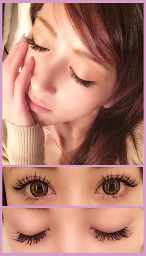 目頭はカールの強いCCカール10mm、中央はCCカール11mm、目尻はCカール11mmで仕上げています。太さは0.2mmと0.15mmをミックス致しました。美咲さんの綺麗な顔立ちをより一層魅力的にさせるキュートなタレ目風デザインとなっております。